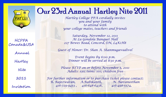 HCPPA Canada & USA and MGHS PPA jointly presents the Kalaivizha on the 30th anniversary of Inaugural of HCPPA Canada & USA. All Hartleyites are kindly invited to attend.