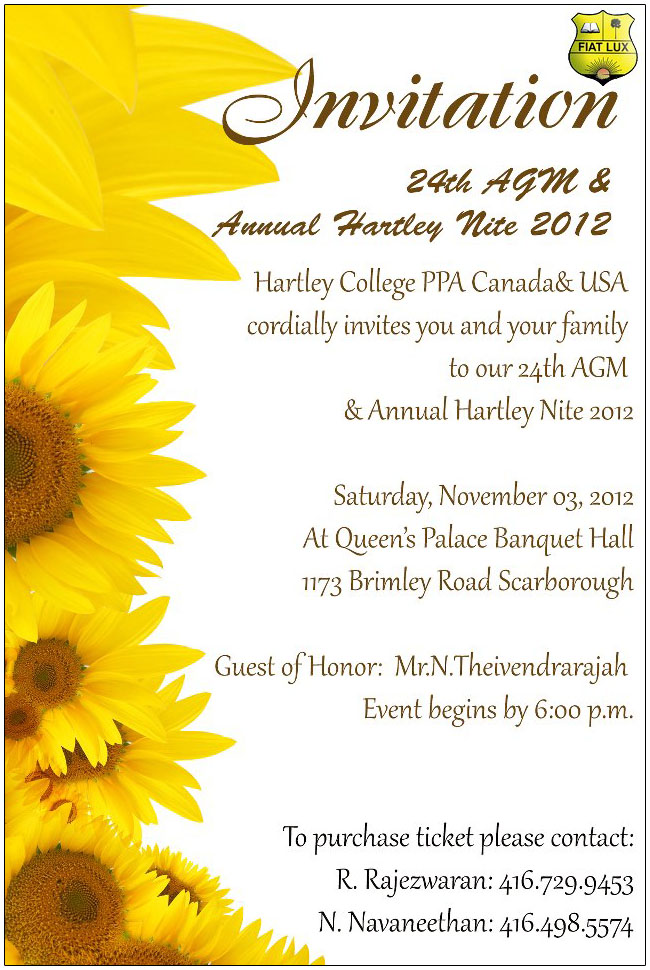 We are holding the 25th Annual General Meeting of the Hartley College Past Pupils Association Canada/USA on this Sunday, November 17, 2013 at the Queen's Palace Banquet Hall, located at 1173 Brimley Road, Scarborough Ontario. Since the event is scheduled on a Sunday, we will start the AGM at 4:30 p.m.