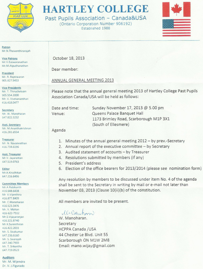 Annual General Meeting of Hartley College Past Pupils Association Canada & USA will be held on Saturday, October 22, 2016 at 5:00 PM at the New Jaasmin Banquet Hall, located at 90 Nolan Court, Markham, Ontario.