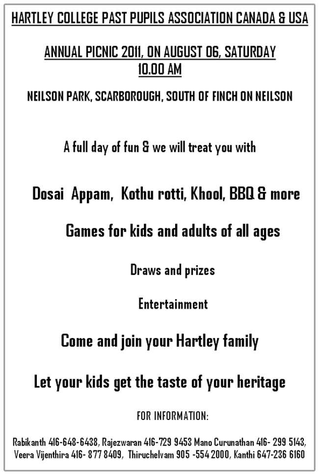 The 8th annual cricket encounter of Hartley College Vs Jafffna Hindu College is scheduled for Monday, July 02, 2001 at Sunnybrook Park. Dr. Sivaraman will be the chief guest for the event. Plenty of food will be available for all our members, families and friends.